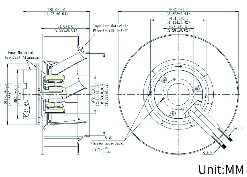 重量 ≈ 1500g (52.91 oz) 大小 225x125(MM) 底座材料 壓鑄鋁-Die Cast Alumimum 葉輪材料 塑料-Plastic (UL 94V-0) 氣流方向 V 旋轉方向 順時(shí)針,朝向轉子觀(guān)察 絕緣等級 “B” 水分(F)環(huán)境(H)防護等級 第三代 最大允許環(huán)境電機溫度(運輸/儲存) 70,000hrs (40℃) 批準 東非共同體